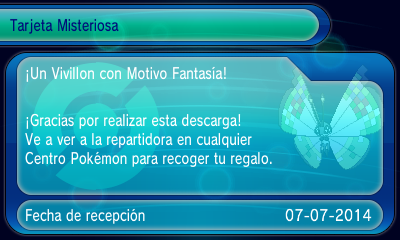 Hoy a las 12:00 hemos llegado a los 100 millones de intercambios de Pokémon en Pokémon X y Pokémon Y. Para celebrarlo TPCi nos ha preparado un pequeńo evento de Pokémon. Y es que tal y como anunciaron hace unas semanas, desde hoy mismo y hasta el 31 de julio podemos obtener el Motivo Fantasía de Vivillon. Además, este Vivillon conoce Manos Juntas, un movimiento exclusivo e inútil. También conoce Tornado, Pantalla de Luz y Estoicismo y se encuentra al nivel 12 en una Gloria Ball.  A continuación puedes ver cómo obtener a este Vivillon Motivo Fantasía: primero conecta tu consola Nintendo 3DS a Internet y ve a la opción Regalo Misterioso del menú principal. En este menú debes elegir Recibir Regalo y luego Recibir Regalo por Internet. Finalmente en tu partida la repartidora que hay junto a la enfermera del Centro Pokémon te entregará a este Pokémon.El motivo Fantasía es el segundo motivo secreto revelado tras el Vivillon de motivo Poké Ball que se reveló hace unas semanas para el Centro Pokémon de París.Eso es todo por ahora.@pokexperto |