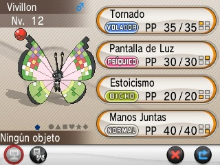 Todavía no sabemos cómo se va a repartir exactamente este Pokémon, pero sí que lo harán cuando lleguemos a los 100 millones de intercambios en GTS. Como ya llevamos 87 millones, esto quiere decir que al ritmo actual de intercambios sería repartido en junio de 2014 (quizá antes si se aceleran los intercambios). La forma de reparto será global dado el motivo que justifica su reparto.  Este Vivillon conoce Manos Juntas, un movimiento exclusivo e inútil. El motivo Fantasía es el segundo motivo secreto revelado tras el Vivillon de motivo Poké Ball que se reveló hace unas semanas para el Centro Pokémon de París.