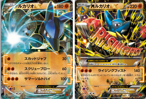En el apartado de Pokémon EX contaremos con Lucario EX, Mega Lucario EX, Heracross EX, Mega Heracross EX y Hawlucha EX. De ellos sabemos que Lucario EX es el primer Pokémon que tiene 3 ataques desde el reinicio del juego con Blanco y Negro. Tiene Golpe Ráfaga con 30 de dańo que no se ven afectados por resistencia,  Golpe Tuerca, que hace 60 de dańo y permite robar cartas hasta tener 6 cartas en mano, y   Salto Mortal para causar 100 de dańo. Por su parte, Mega Lucario EX tiene   Puńo Ascendente, que hace 140 de dańo y descarta una Energía al Pokémon rival. Por otro lado, Hawlucha EX tiene la habilidad Retribución (hace 20 puntos de dańo al Pokémon rival que lo dańe) y   Golpe Lunar con 60 puntos de dańo y 40 más si hay un Estadio en juego. También tenemos a Pancham, que permite buscar un Pangoro en la baraja y evolucionarlo rápido si tienes Pokémon Oscuros en juego con Evolución Pendenciera y hace 30 puntos de dańo con   Autoestima. Por su parte Pangoro tiene la habilidad Piel de Líder que aumenta su PS en 20 por cada Pokémon en Banca mientras sea el Pokémon Activo y usa   Puńo Loco que causa 80 de dańo y 40 más si sufre una Condición Especial. Finalmente, en cuanto a cartas de entrenador y energía, las novedades son la Energía Fuerte que sólo puede unirse a Pokémon de tipo Lucha y da 1 Energía Lucha a la vez que aumenta en 20 el dańo de sus ataques, el Estadio de Lucha que aumenta en 20 el dańo de ataques contra Pokémon EX activos, y Corelia, un partidario que permite buscar un Objeto y un Pokémon de tipo Lucha en la baraja. Finalmente sabemos que la colección incluirá cartas de Sylveon, Dedenne, Ursaring, Golurk, Machamp, Landorus y Tyrantrum. Los mazos temáticos se basarán en Sylveon y Pangoro.