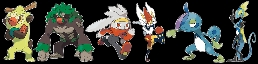 Imágenes de las evoluciones de Grookey, Scorbunny y Sobble: Thwackey, Rillaboom, Raboot, Cinderace, Drizzile e Inteleon.