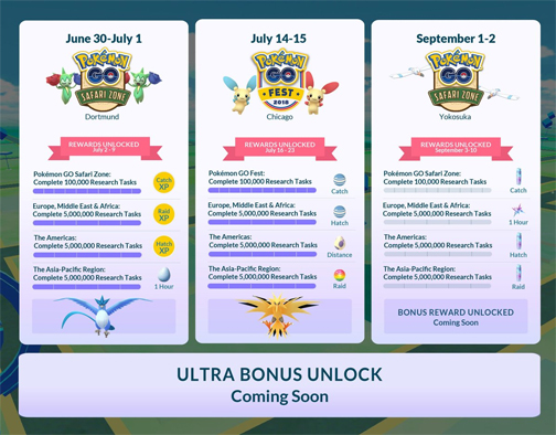 - 16 a 23 de julio: Bonus de Caramelos y Eclosión de Huevos activados por realizar tareas de investigación durante el Pokémon GO Fest de Chicago (14 y 15 julio).