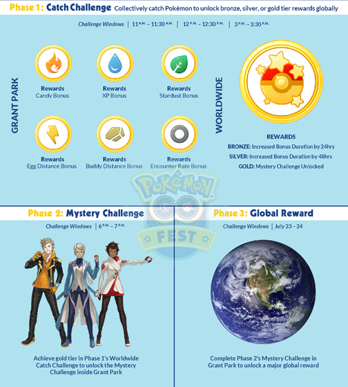 - Ventanas de Desafío: Durante el día, habrá tres Ventanas de Desafío en las que los Entrenadores en todas partes trabajarán junto a los Entrenadores en Chicago para desbloquear premios globales. Durante las Ventanas de Desafío, los Entrenadores en Grant Park intentarán a desbloquear los beneficios para los jugadores alrededor del mundo capturando ciertos tipos de Pokémon.