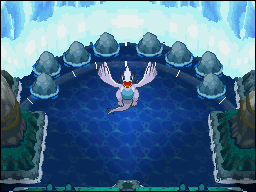 La primera vez que llegues a la gran cascada de las Islas Remolino, tras haberte abierto camino por las cuevas y haber mostrado tu valía con la Campana Oleaje y el Ala Plateada, te encontrarás con que las Chicas Kimono rinden culto al Pokémon legendario Lugia.