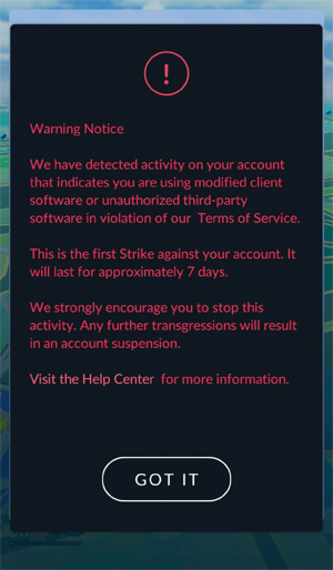 Esta pantalla aparece cuando el juego ha detectado que tu cuenta ha sido utilizada conjuntamente con otras aplicaciones instaladas que incumplen los Términos y Condiciones de Uso de Pokémon GO. Tienes más información sobre las trampas en Pokémon GO y sus consecuencias. |