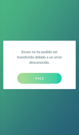 Este error tiene lugar cuando intentas transferir un Pokémon y justo entonces hay un problema de conexión con el servidor. El Pokémon puede haberse transferido realmente o no, en cuyo caso deberás esperar un rato para hacerlo de nuevo. |