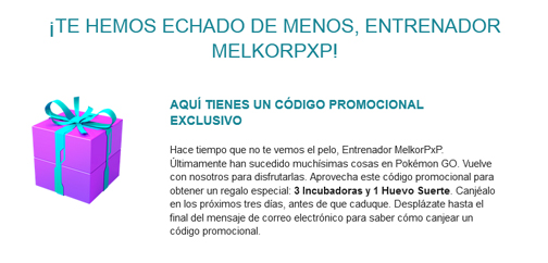 El correo oficial de Pokémon GO Live en ocasiones envía un correo con un código promocional para que vuelvas a jugar a Pokémon GO. Esto ocurre principalmente con jugadores que hace tiempo que no se conectan al juego.