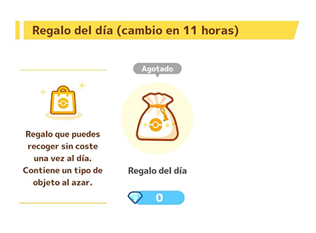 Pokémon Sleep analiza tus hábitos de sueńo para con ello generar los datos necesarios para la experiencia de juego: ![]() Regalo del Día de Pokémon Sleep:Pokémon Sleep ańade el Regalo del Día el 14 de diciembre de 2023 para incentivar que visites la Tienda de Pokémon Sleep todos los días.» Nuevo Regalo: Todos los días aparece un nuevo regalo en esta sección de la Tienda a las 4:00 (hora local). Lista de Objetos:Los objetos que puedes obtener con el Regalo del Día son los siguientes: