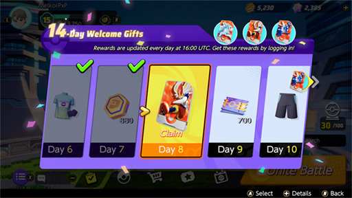 - Inicio de Sesión: Licencias Unite y un Holoatuendo de varios Pokémon por iniciar sesión durante el evento: