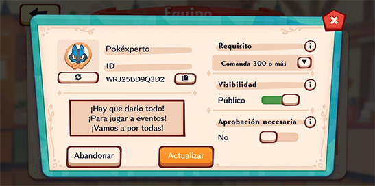 Introducción: Cada jugador debe decidir si se une a un equipo ya existente (para lo cual hay un buscador o se puede introducir el ID de equipo) o crea su propio equipo para atraer a otros jugadores (por 300 Bellotas).