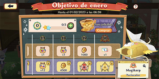 Los premios especiales de este mes son Magikarp, Galletas de Magikarp y Magikarp Shiny. Las recompensas de Bellotas del menú premium aumentan un 50% (de 3000 a 4500 Bellotas) y algunas recompensas de Tartaletas se duplican.