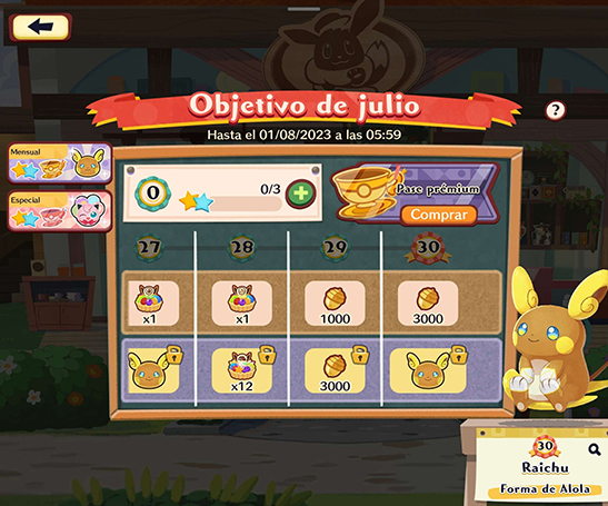 Los premios especiales de este mes son Raichu de Alola, Galletas de Raichu de Alola y mejoras de su atuendo.