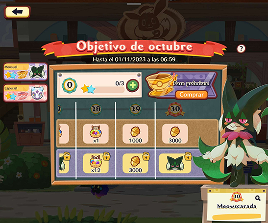 Los premios especiales de este mes son Meowscarada, Galletas de Meowscarada y mejoras de su atuendo.