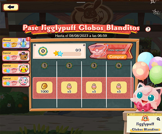 Los premios de este pase son Jigglypuff Globos Blanditos y Tartaletas.