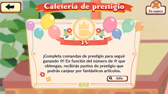 Cafetería de Prestigio en Pokémon Café Mix:Uno de los modos de juego de Pokémon Café Mix es la Cafetería de Prestigio. En esta sección tienes la información sobre esta modalidad de juego. Ten en cuenta que debes llegar al Final de las Comandas Ordinarias para acceder a la Cafetería de Prestigio.La Cafetería de Prestigio funciona de la siguiente manera: