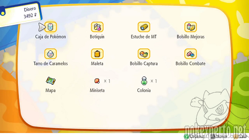 Caja de Pokémon:Hasta los últimos juegos de la saga principal de Pokémon, Pokémon Ultrasol y Ultraluna, el Sistema de almacenamiento de Pokémon era el de siempre, con el clásico número de cajas en el PC en las que se podían almacenar hasta 30 Pokémon con objetos equipados en cada una. Se encontraban en cualquier Centro Pokémon o Guardería Pokémon.En Pokémon: Let's Go, Pikachu! y Let's Go, Eevee! el concepto cambia por completo y se convierte en un sistema más simple: la Caja de Pokémon. Por primera vez en la saga principal, todos los Pokémon irán siempre contigo. Podrás encontrarlos en la Bolsa, por lo que no tendrás que ir al Centro Pokémon para cambiarlos, aunque sí para curarlos. Como podemos comprobar en la imagen, se pueden almacenar hasta 1.000 Pokémon y ańadirlos desde ahí al Equipo, o ponerle las Marcas, generalmente utilizadas para recordar las estadísticas con mejores valores individuales del Pokémon: La última opción del sistema nos permite Transferir hasta 30 Pokémon al Profesor Oak, lo cual nos servirá para el Entrenamiento: