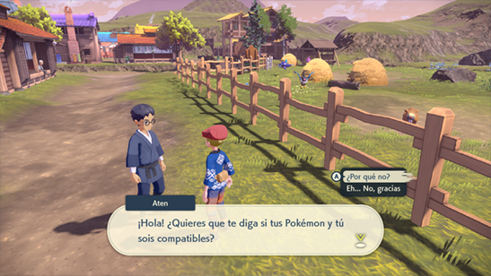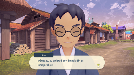 Veo que os une una bonita amistad. ˇPero Pokémon y tú aún podéis estrechar más vuestros lazos! Pokémon seems to get on well with you. But I’m sure it could get on better![ |