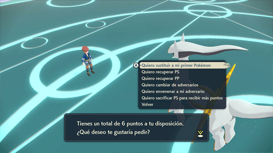- Deseos: Puedes usar los puntos para pedir deseos que te permiten recuperar los PS de tus Pokémon o cambiar el primer Pokémon de tu equipo, entre otros.