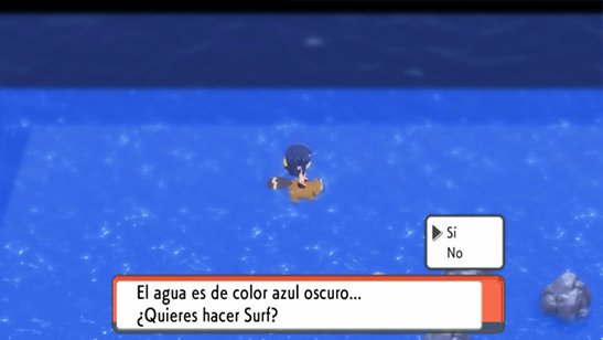 - Presiona A para surfear. Te saldrá la pregunta confirmando si quieres surfear, y en este momento debes pulsar A para confirmar al mismo tiempo que presionas Abajo justo cuando saltas al agua para usar el objeto clave asignado.