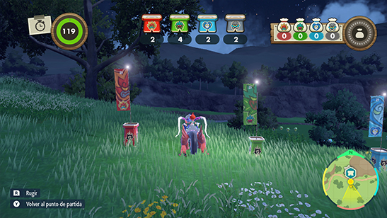 » Tu Pokémon puede Rugir (Botón R) para ahuyentar a Pokémon glotones. También puedes pulsar el Botón Y para volver a la base de Peanas, soltando todas las Bayas.