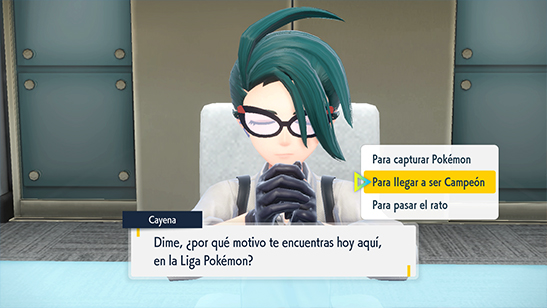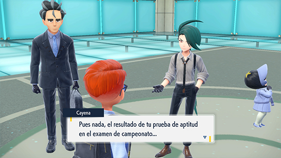 Tras recibir la bienvenida de Ságita y comprobar que tienes las 8 Medallas de Gimnasio, te dan acceso a la sala de entrevistas, donde Cayena te hace una serie de preguntas como primera parte del examen de campeonato antes de darte acceso a los combates.