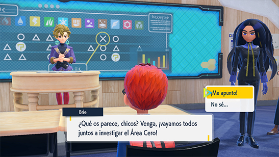 Brie ha conseguido por fin permiso para ir a investigar los misterios del Área Cero y el Pokémon legendario Terapagos. La presidenta de la Liga Pokémon de Paldea, Ságita, aparece para confirmar la autorización y pedir que ayudéis a Brie con la investigación.
