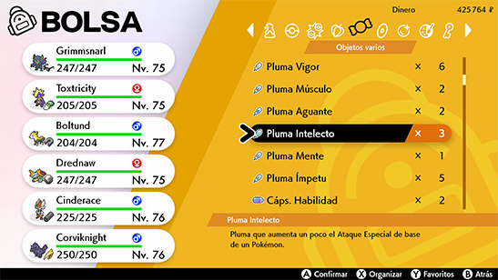 » Las Vitaminas se compran en el Centro Pokémon de Ciudad Puntera (por 10.000 ) o de Ciudad Artejo (por 2 PB), mientras que las Plumas las puedes recoger siempre que cruces los puentes entre Rutas de Galar: