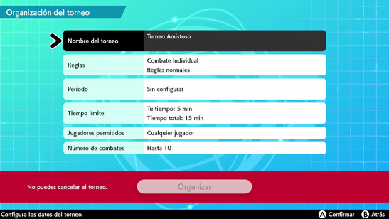 - Configuración: Los Torneos tienen distintas opciones de configuración: nombre, Combate Individual o Doble, Reglas Normales o Especiales, período de participación, tiempos límite (por jugador y total), jugadores permitidos, número de combates permitidos al día y restricciones horarias.