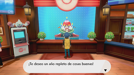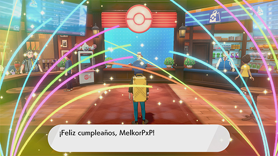 El día de tu cumpleańos, si visitas cualquier Centro Pokémon de la Región de Galar, te harán una fiesta de bienvenida con confetti y una tarta en la pantalla del Centro Pokémon. La Enfermera y el gerente de la Tienda Pokémon te felicitan por tu cumpleańos.
