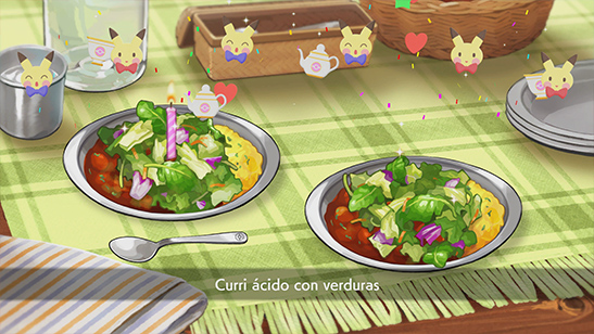 El día de tu cumpleańos, cualquier curri que cocines en el Poké Campamento vendrá acompańado de confetti y el plato de la izquierda (el tuyo) tendrá una vela de cumpleańos.