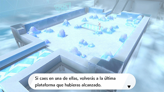 - Prueba del Gimnasio: La prueba consiste en superar varias zonas de caída libre sobre una plataforma que puedes controlar girando el Joystick en un sentido o en otro, aprovechando las garras de fantasma para recuperar impulso. Por el camino tendrás que derrotar a varios Entrenadores.