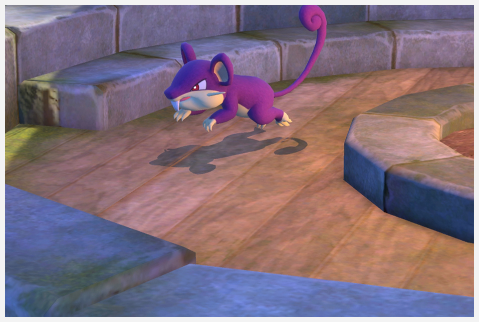 Bailando con Rattata y Trubbish en el centro del campamento tras usar la Melodía, para lo cual debes hacer que Sudowoodo vaya primero activando la Cristaflor cuando se encuentra cerca y esperar a que Rattata le siga (ruta alternativa) |