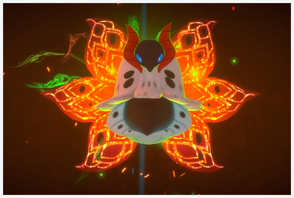 Volcarona aparece cubierto por llamas de fuego que evitan que puedas ver su Fenómeno Lumini.