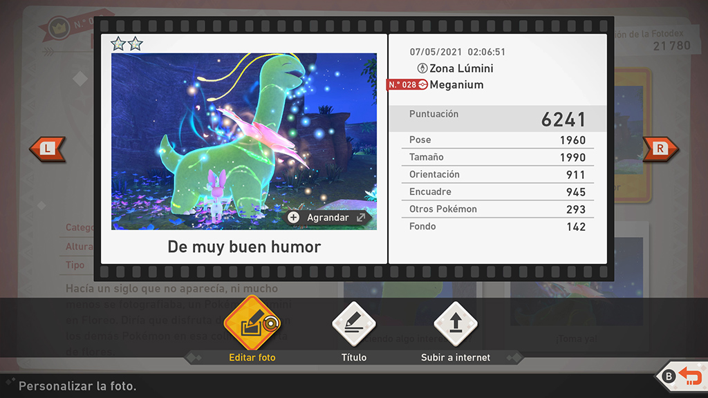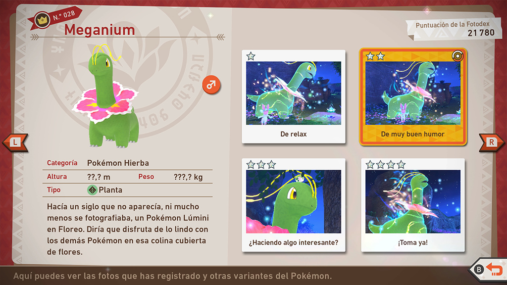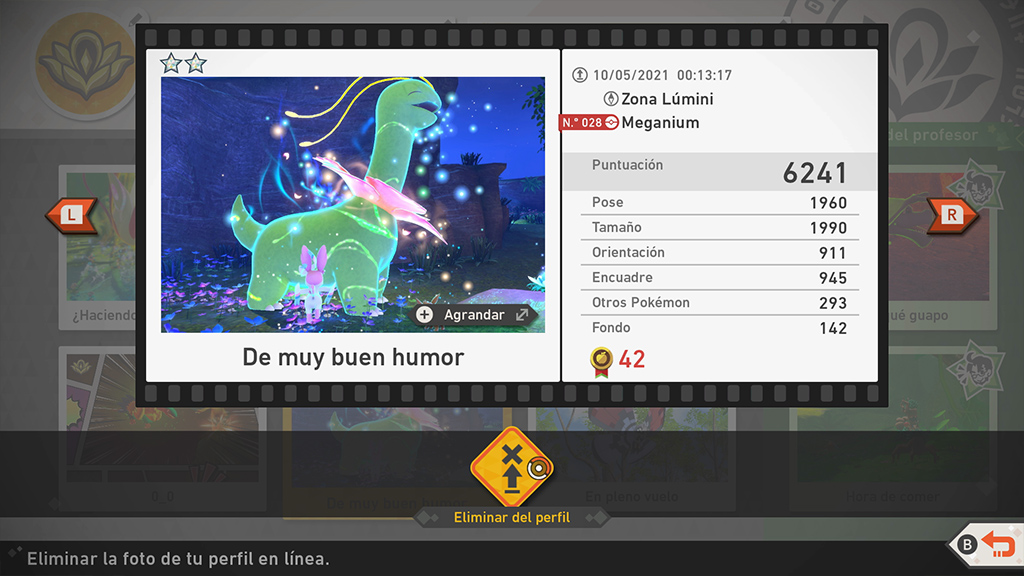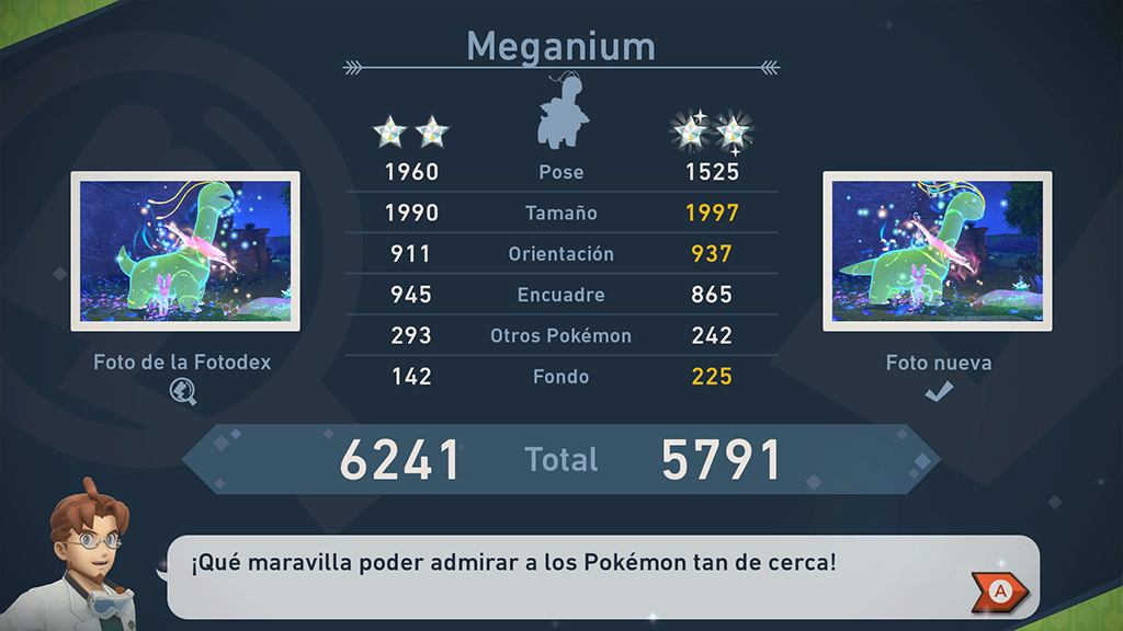 - Estrellas: El número de estrellas de la foto indica la rareza de la situación en la que has tomado la foto. Para completar la Fotodex, debes registrar una foto de 1 a 4 estrellas de todos los Pokémon.