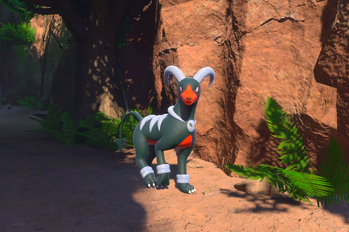 Saca una foto de Houndoom en el exterior relajado y bostezando.