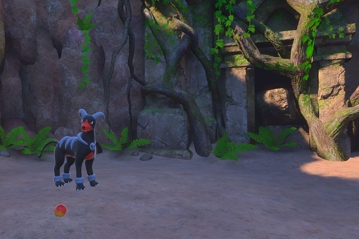 Saca una foto de Umbreon en la entrada a las ruinas. Para ello debes hacer que Noivern se vaya usando la Melodía y luego lanza una Blanzana a Salandit para que lo llame.