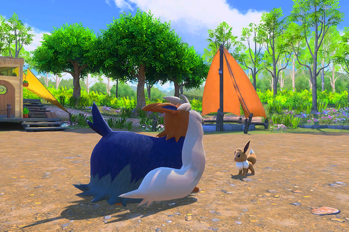 Saca una foto de Stoutland mientras corre por el campamento tras hacerle feliz. Para ello debes atraerlo a él y a Eevee al centro del campamento con Blanzanas y usar Orbe Lúmini en ambos.