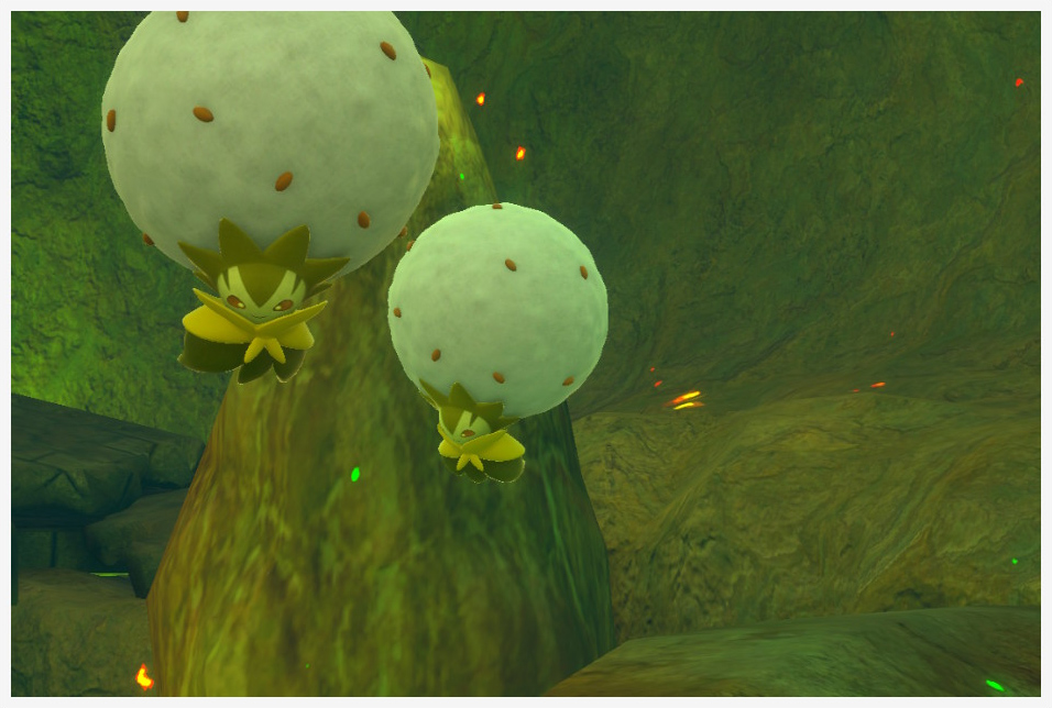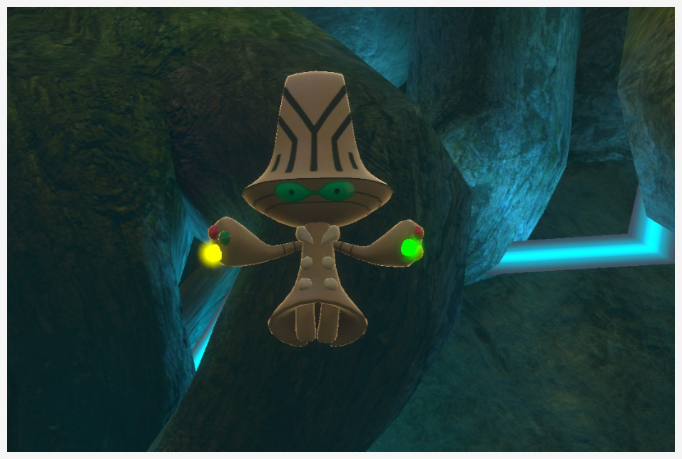 Saltando de lo alto del exterior de las ruinas Usar Orbe Lúmini en el Natu dormido encima del hombro del Golurk del interior de las ruinas para que despierte Mostrando alegría tras comerse una Blanzana |