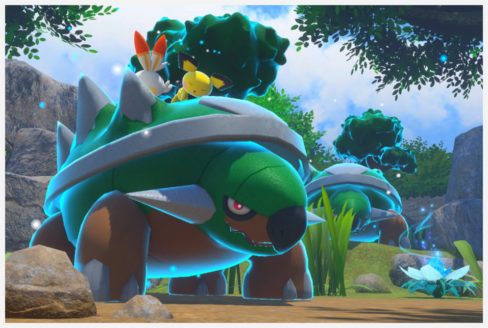 Al caer al suelo buscando a Scorbunny y Pichu al salir del segundo tronco Luchando con el Torterra que protege a Scorbunny y Pichu |
