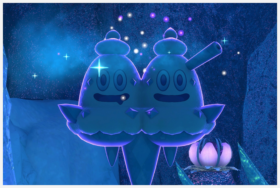 Despertar al segundo Crabominable de la zona al otro lado del muro de nieve y usar Orbe Lúmini para que tire a los Snom del árbol Golpear con una Blanzana a Snom para que caiga de las estalactitas de la cueva de la ruta principal y se quede colgando de un hilo |