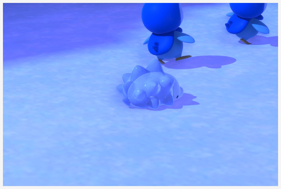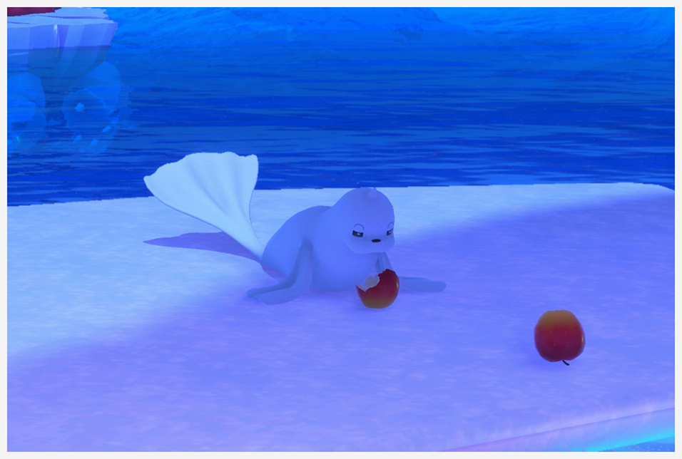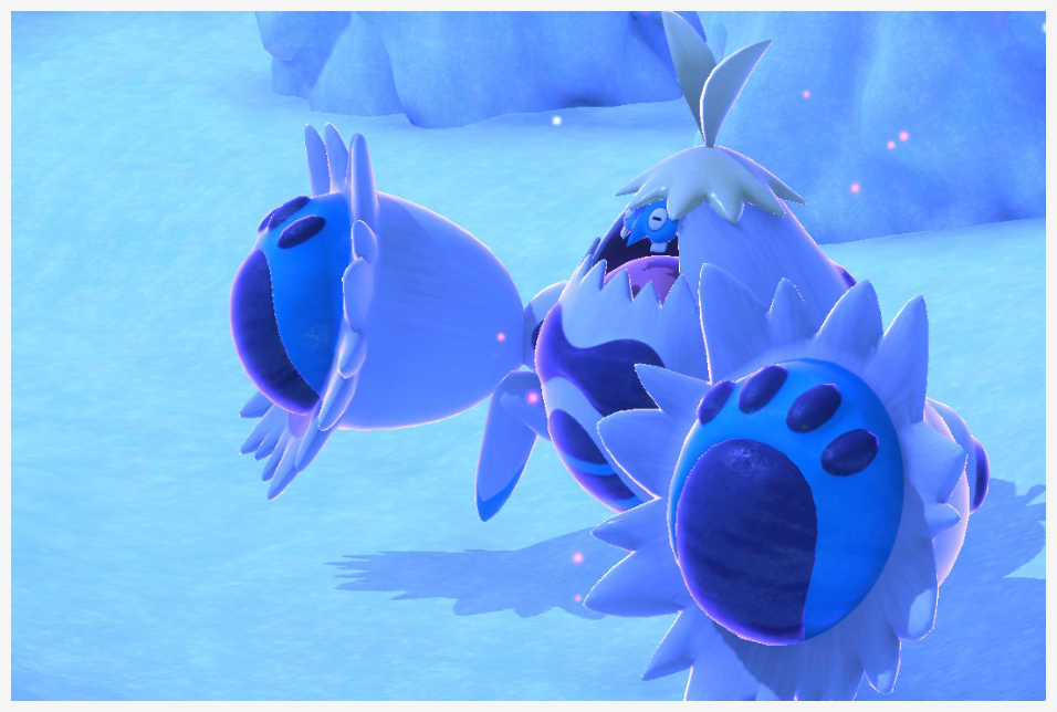Trío de Spheal aplaudiendo a Vulpix de Alola al final de la ruta principal - debes tirarles una Blanzana antes de que Abomasnow los asuste |